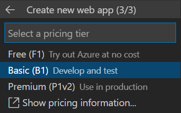 --skuparameter defines the size (CPU, memory) and cost of the app service plan. This example uses the B1 (Basic) service plan, which will incur a small cost in your Azure subscription. For a full list of App Service plans, view the App Service pricing page. - The