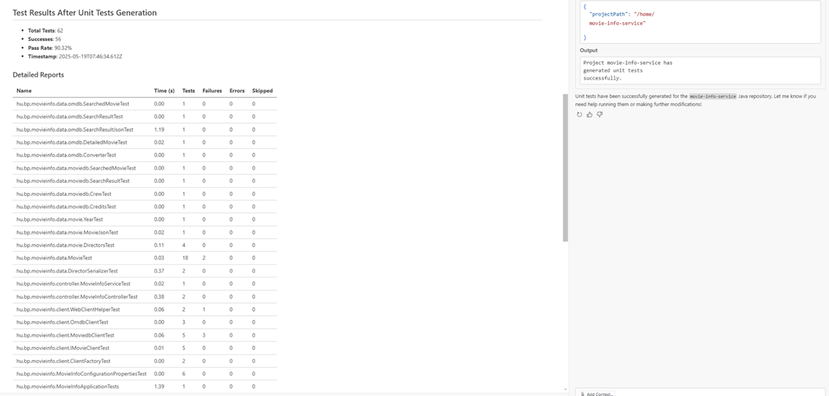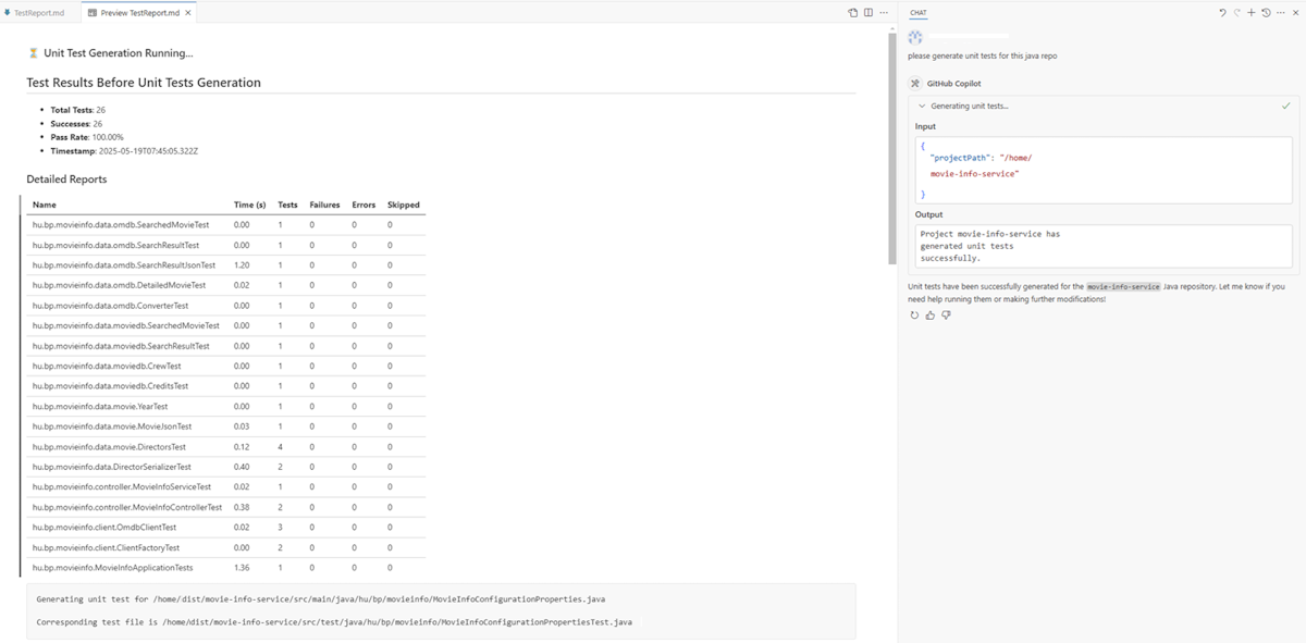 As part of the process, the tool generates a TestReport.md file that tracks test generation progress and provides a summary of test results both before and after test generation. The report includes the following details: