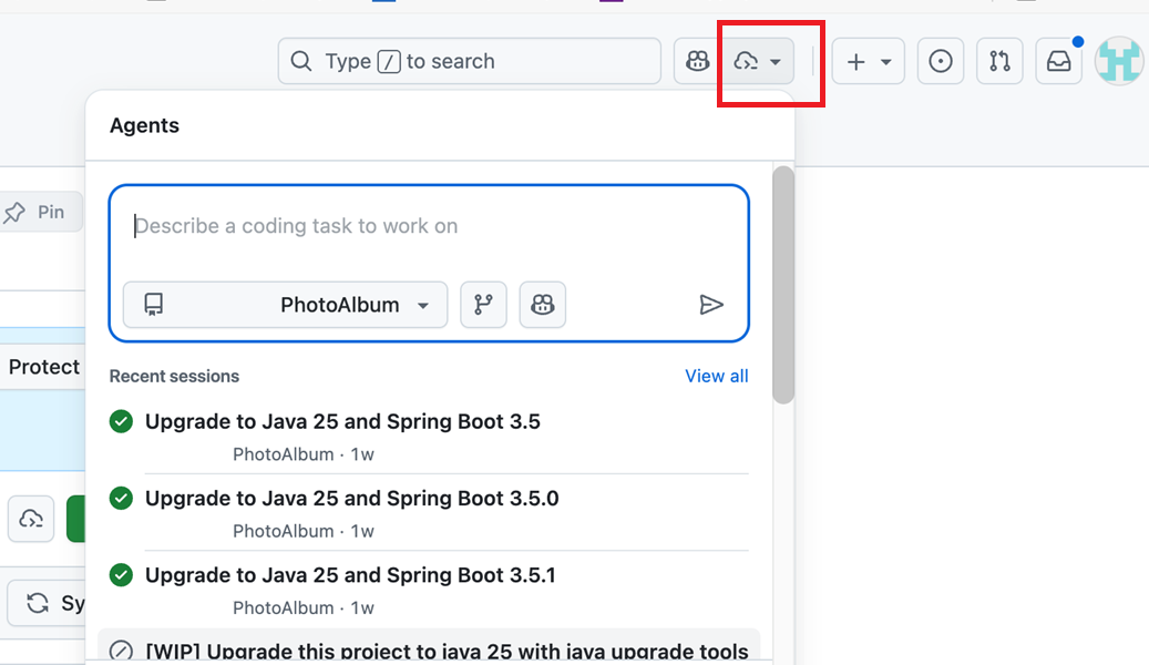 Open the Agents panel in the top-right corner and enter your prompt. After the prompt is entered, Copilot starts a new session and opens a new pull request, which appears in the list below the prompt box. Copilot works on the task and then adds you as a reviewer when it's finished, triggering a notification.