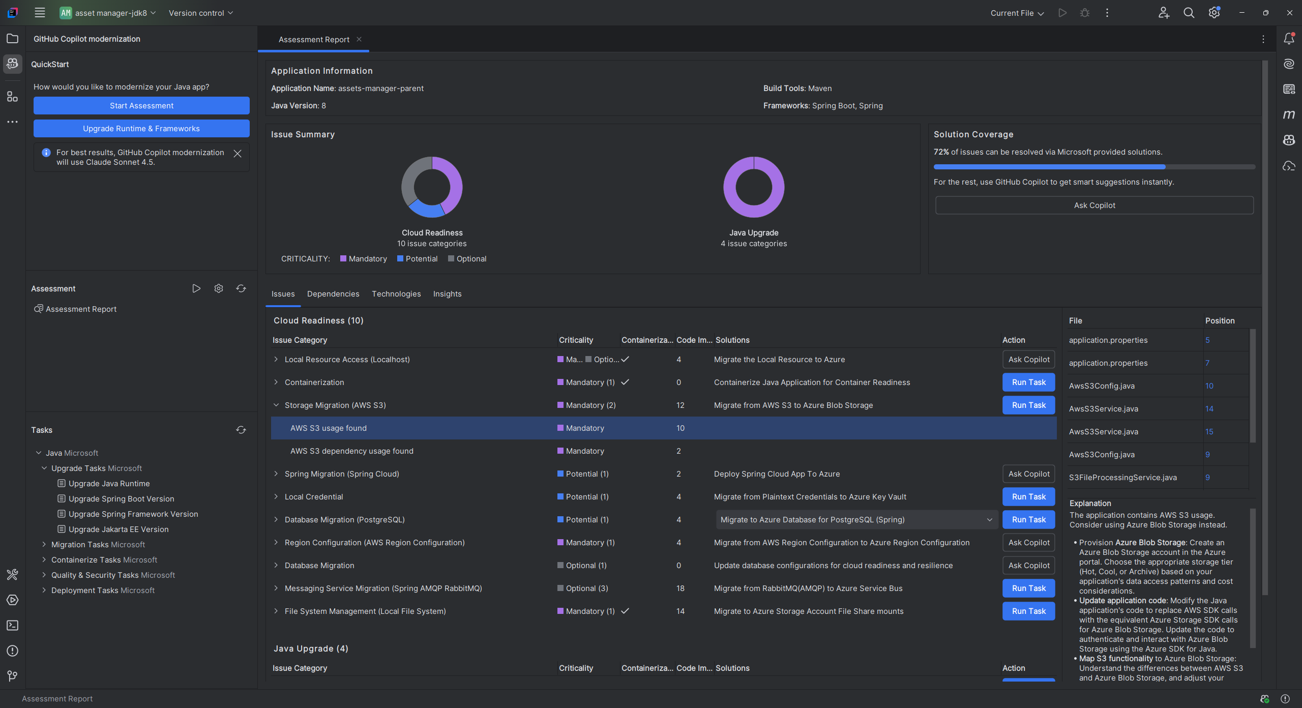 When reviewing the summary report, you can select Migrate to Azure SQL Database (Spring) from the solution list under the issue Database Migration (Microsoft SQL). Then, select Run Task to move to the code remediation stage.