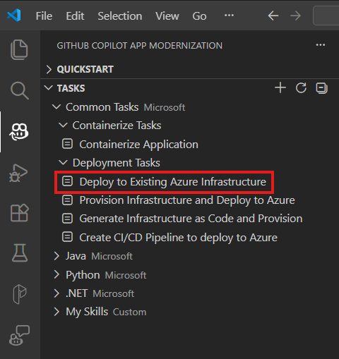 In the Tasks section, open Deployment Tasks and select Deploy to Existing Azure Infrastructure.
