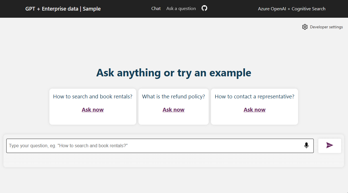 This article shows you how to deploy and run the Chat with your data sample for JavaScript. This sample implements a chat app using JavaScript, Azure OpenAI Service, and Retrieval Augmented Generation (RAG) in Azure AI Search to get answers about rental properties. The rental properties chat app is seeded with data from markdown files (*.md) including a privacy policy, terms of service, and support.