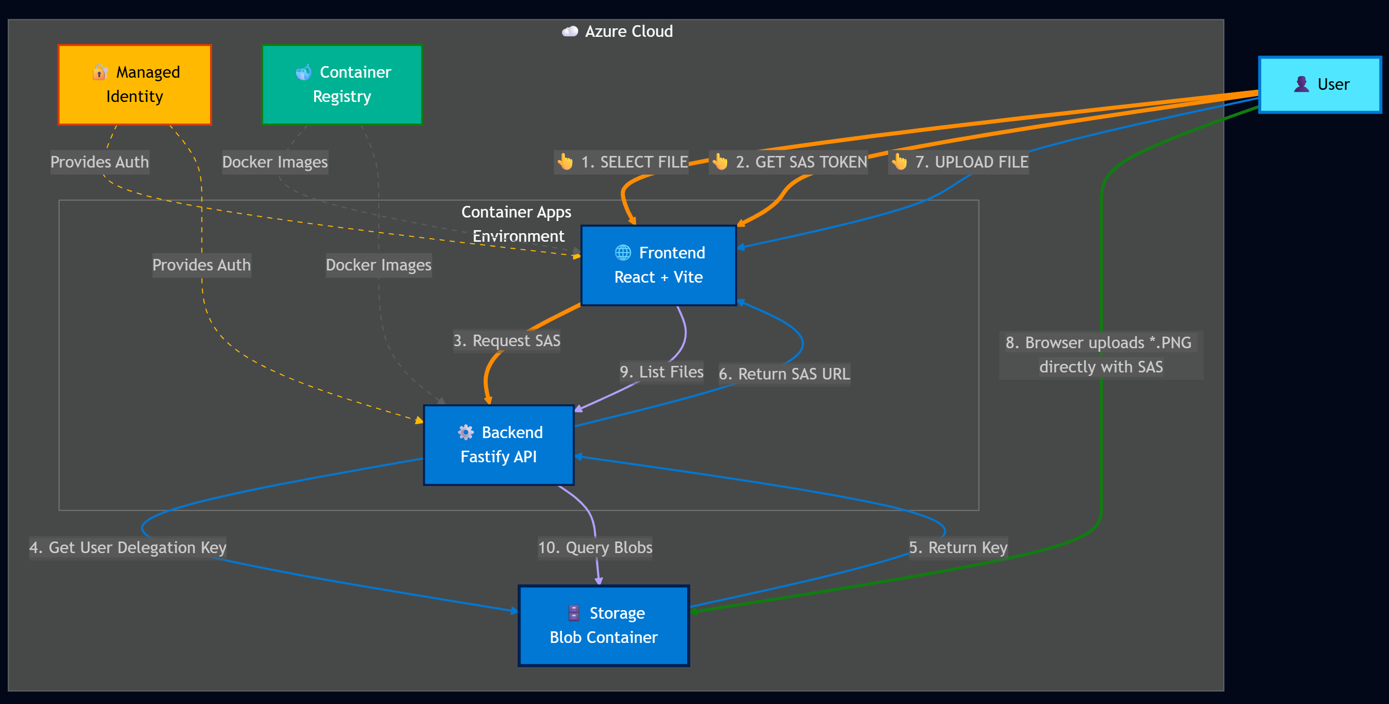 The application uses User Delegation SAS tokens for secure, keyless authentication. These tokens are signed with Microsoft Entra ID credentials through Managed Identity. The API generates short-lived tokens (10-60 minutes) with specific permissions (read, write, or delete), allowing the browser to upload files directly to storage without exposing credentials.