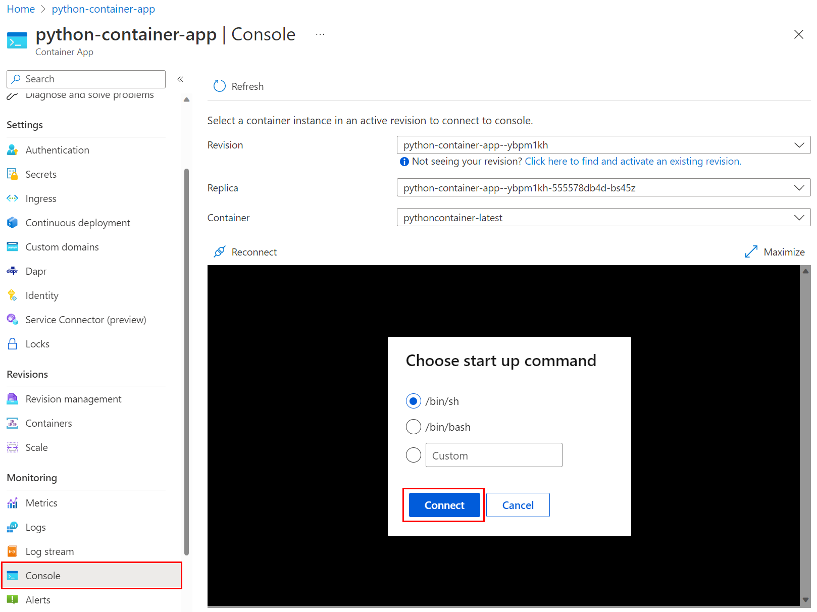 az containerapp exec \ --name $CONTAINER_APP_NAME \ --resource-group $RESOURCE_GROUP_NAMEThen, at the shell command prompt, enter