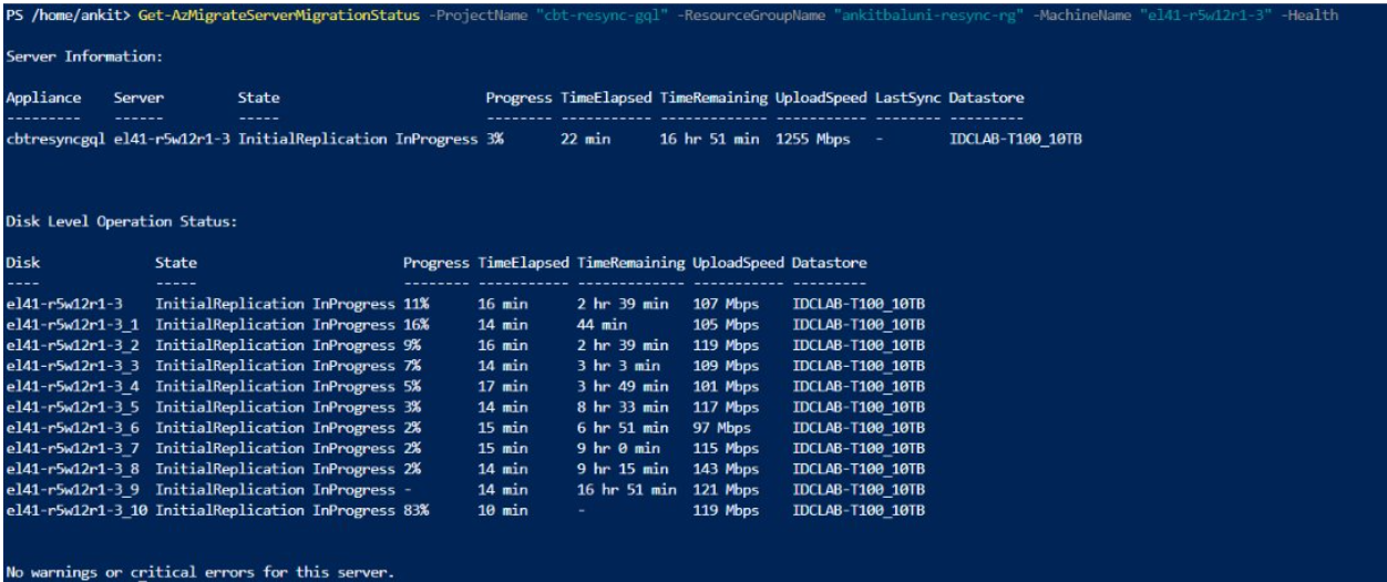 Get-AzMigrateServerMigrationStatus -ProjectName "<your-project-name>" -ResourceGroupName "<your-resource-group>" -MachineName "<your-server-name>" -Health