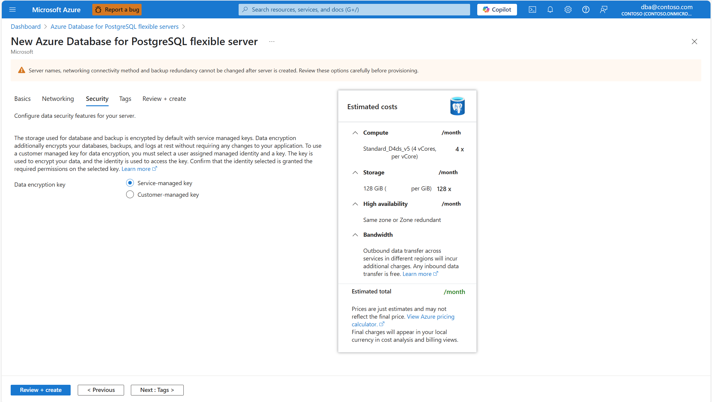 During provisioning of a new Azure Database for PostgreSQL flexible server instance, data encryption is configured in the Security tab. For Data encryption key, select the Service-managed key radio button.