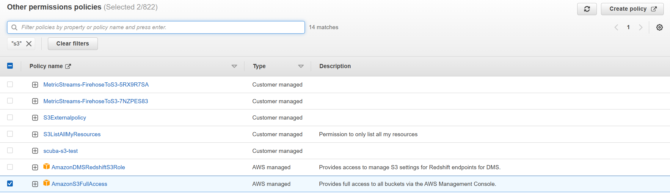 8. Search for the AmazonS3FullAccess and CloudWatchLogsReadOnlyAccess policies and attach them.