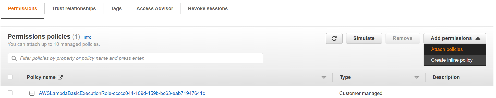 7. Under Permissions policies, select Add permissions > Attach policies.