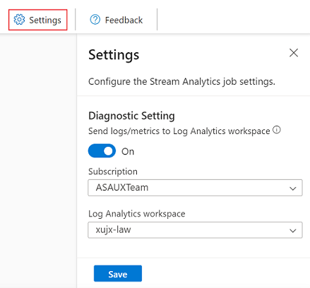 Runtime logs appear at the warning, error, or information level when a job is running. These logs are helpful when you want to edit your Stream Analytics job topology or configuration for troubleshooting. We highly recommend that you turn on diagnostic logs and send them to Log Analytics workspace in Settings to have more insights into your running jobs for debugging.