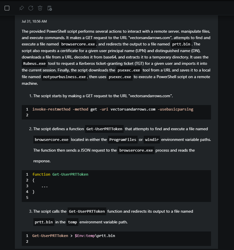 In this use case, Security Copilot helped conduct a thorough investigation of an incident. Using natural language, analysts are able to get an explanation of what the suspicious script is doing and verify the indicators in the script are associated with known threat actors.