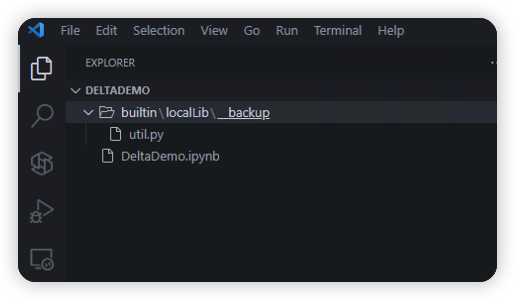 På følgende skærmbillede vises den util.py fil, der er flyttet til den _backup undermappe under mappen localLib , fordi nogen har slettet den i fjernarbejdsområdet.