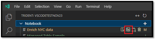 - Ændret: M-tegnet til højre for navnet og den gule tekst angiver, at du har downloadet og redigeret notesbogen lokalt i VS Code og endnu ikke har publiceret disse ventende ændringer tilbage til fjernarbejdsområdet.