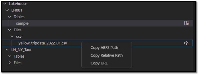 Hvis du vil gøre det nemmere at referere til en tabel, mappe eller fil i koden, kan du kopiere den relevante sti. Højreklik på destinationsnoden, og find indstillingerne for at Kopiér ABFS-sti, Kopiér relativ stieller Kopiér URL-adresse.