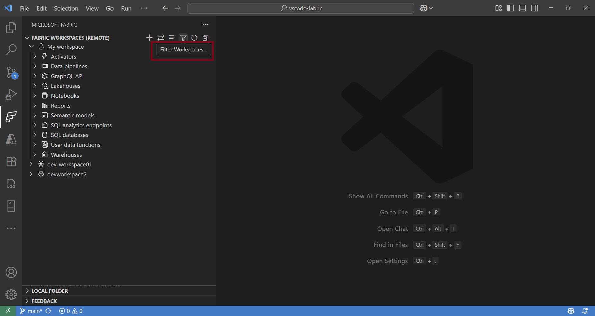Få vist alle dine arbejdsområder i Fabric Explorer. Du kan filtrere de arbejdsområder, du vil arbejde med, i VS Code.