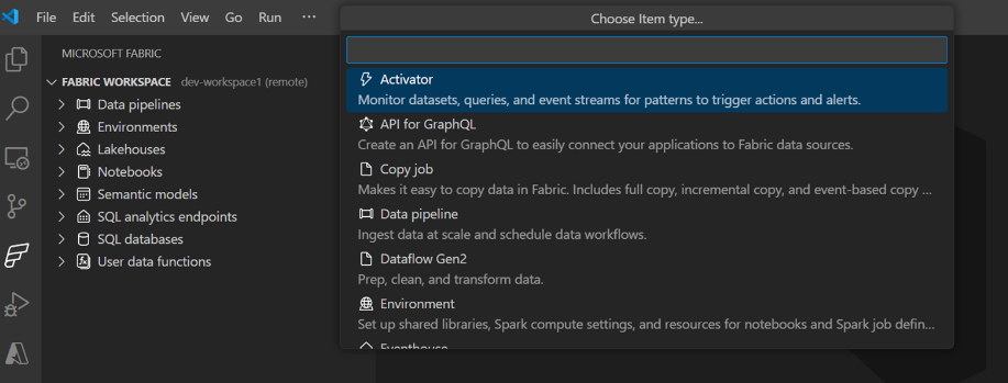 Med Microsoft Fabric Extension kan du nu oprette, slette og omdøbe ethvert Fabric-element direkte i VS Code, hvilket strømliner din arbejdsgang uden nogensinde at forlade VS Code. Du kan også få vist de nyoprettede elementer på Fabric-portalen.