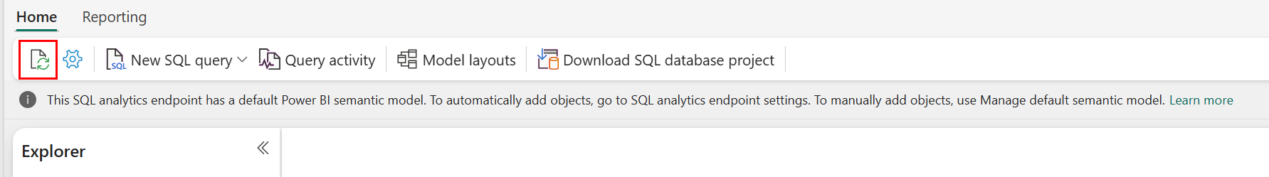 Du kan gennemtvinge en opdatering af den automatiske metadatascanning manuelt på Fabric-portalen. På siden for SQL Analytics-slutpunktet skal du vælge knappen Opdater på værktøjslinjen i Stifinder for at opdatere skemaet. Gå til Forespørg dit SQL Analytics-slutpunkt, og søg efter opdateringsknappen, som vist på følgende billede.