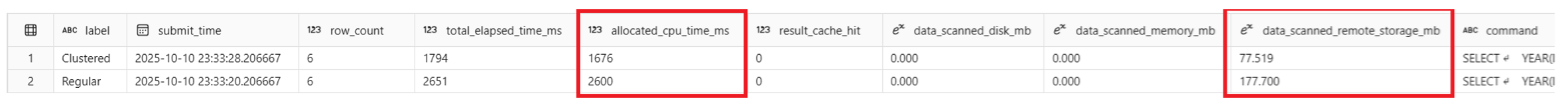 Begge forespørgsler har en rækketælling på 6 og lignende indsendelsestider. Forespørgslen Clustered viser total_elapsed_time_ms 1794, allocated_cpu_time_ms 1676 og data_scanned_remote_storage_mb 77.519. Forespørgslen Regular viser total_elapsed_time_ms 2651, allocated_cpu_time_ms 2600 og data_scanned_remote_storage_mb 177.700. Disse tal viser, at selvom begge forespørgsler gav de samme resultater, brugte Clustered versionen cirka 36% mindre CPU-tid end Regular versionen og scannede cirka 56% mindre data på disken. Der blev ikke brugt nogen cache i nogen af forespørgselskørslerne. Disse er væsentlige resultater, der hjælper med at reducere forespørgselseksekveringstid og forbrug, og gør kolonnen lpepPickupDatetime til en stærk kandidat til dataklyngedannelse.