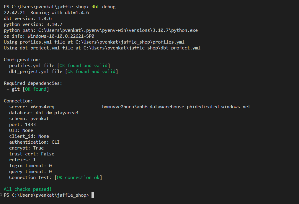 dbt debugi Visual Studio Code-terminalen.dbt debugAlle kontroller overføres, hvilket betyder, at du kan forbinde dit lager ved hjælp af dbt-fabric-adapteren