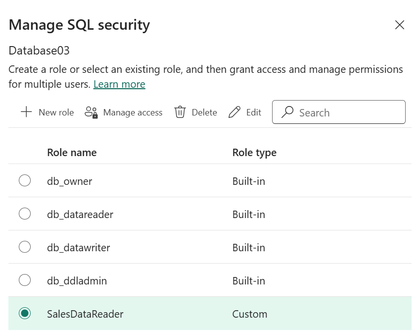 Vælg en indbygget rolle eller en brugerdefineret rolle på siden Administrer SQL-sikkerhed, og vælg Administrer adgang.