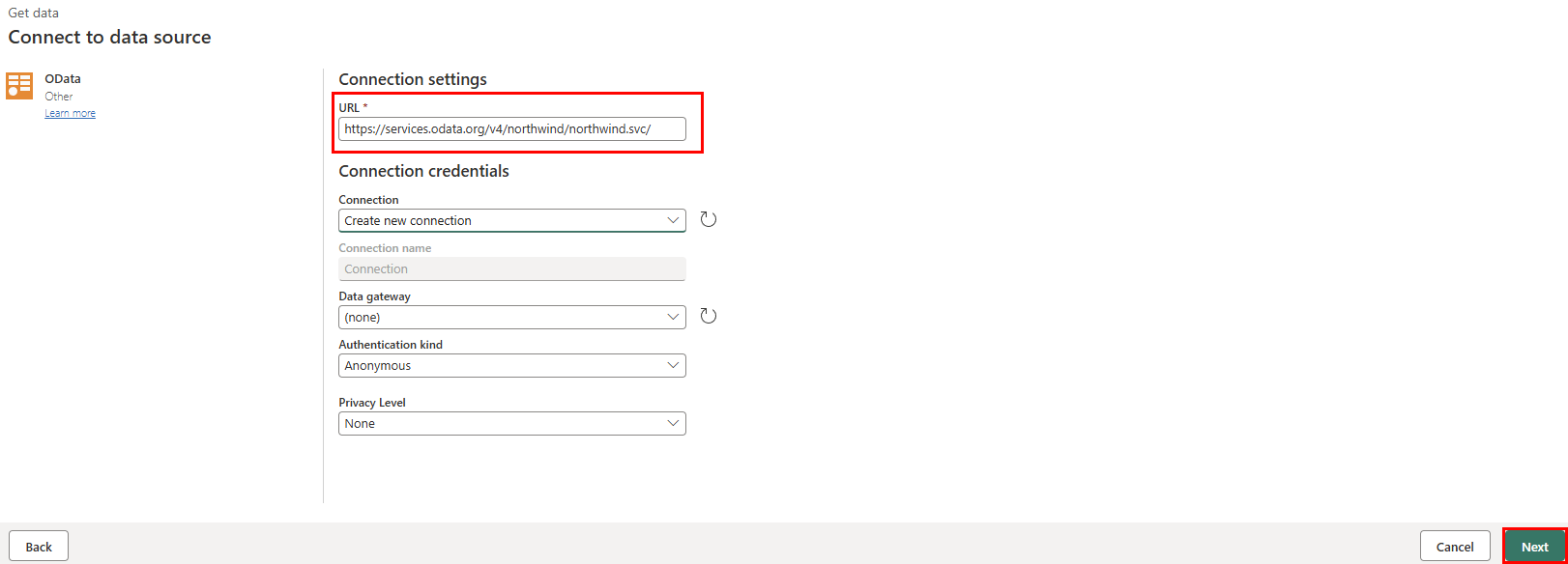 I søgefeltet i Vælg datakilde skal du få vist typen odata.
