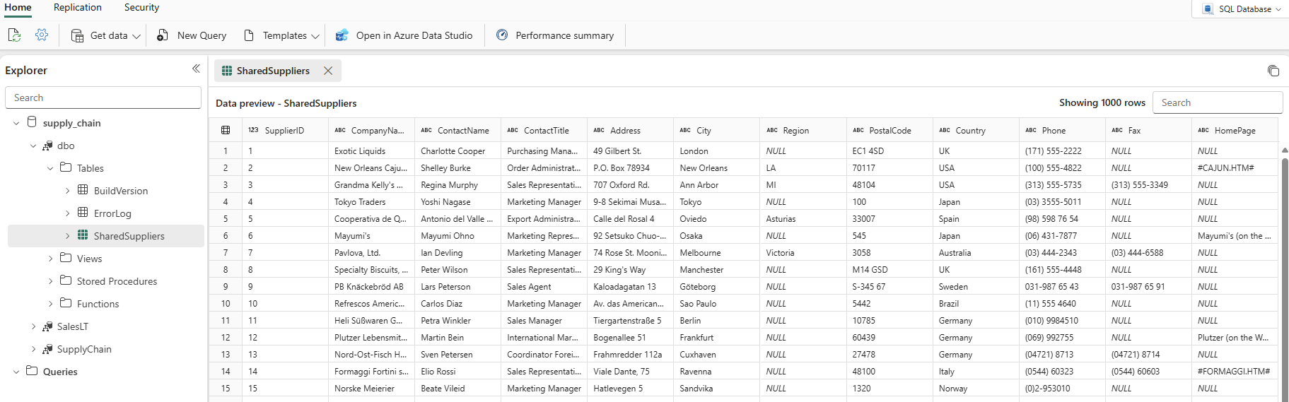 /* Create the Tutorial Schema called SupplyChain for all tutorial objects */ CREATE SCHEMA SupplyChain; GO /* Create a Warehouse table in the Tutorial Schema NOTE: This table is just a set of INT's as Keys, tertiary tables will be added later */ CREATE TABLE SupplyChain.Warehouse ( ProductID INT PRIMARY KEY -- ProductID to link to Products and Sales tables , ComponentID INT -- Component Identifier, for this tutorial we assume one per product, would normalize into more tables , SupplierID INT -- Supplier Identifier, would normalize into more tables , SupplierLocationID INT -- Supplier Location Identifier, would normalize into more tables , QuantityOnHand INT); -- Current amount of components in warehouse GO /* Insert data from the Products table into the Warehouse table. Generate other data for this tutorial */ INSERT INTO SupplyChain.Warehouse (ProductID, ComponentID, SupplierID, SupplierLocationID, QuantityOnHand) SELECT p.ProductID, ABS(CHECKSUM(NEWID())) % 10 + 1 AS ComponentID, ABS(CHECKSUM(NEWID())) % 10 + 1 AS SupplierID, ABS(CHECKSUM(NEWID())) % 10 + 1 AS SupplierLocationID, ABS(CHECKSUM(NEWID())) % 100 + 1 AS QuantityOnHand FROM [SalesLT].[Product] AS p; GODin SQL-database i Fabric-databasen indeholder nu lageroplysninger. Du skal bruge disse data på et senere trin i dette selvstudium.