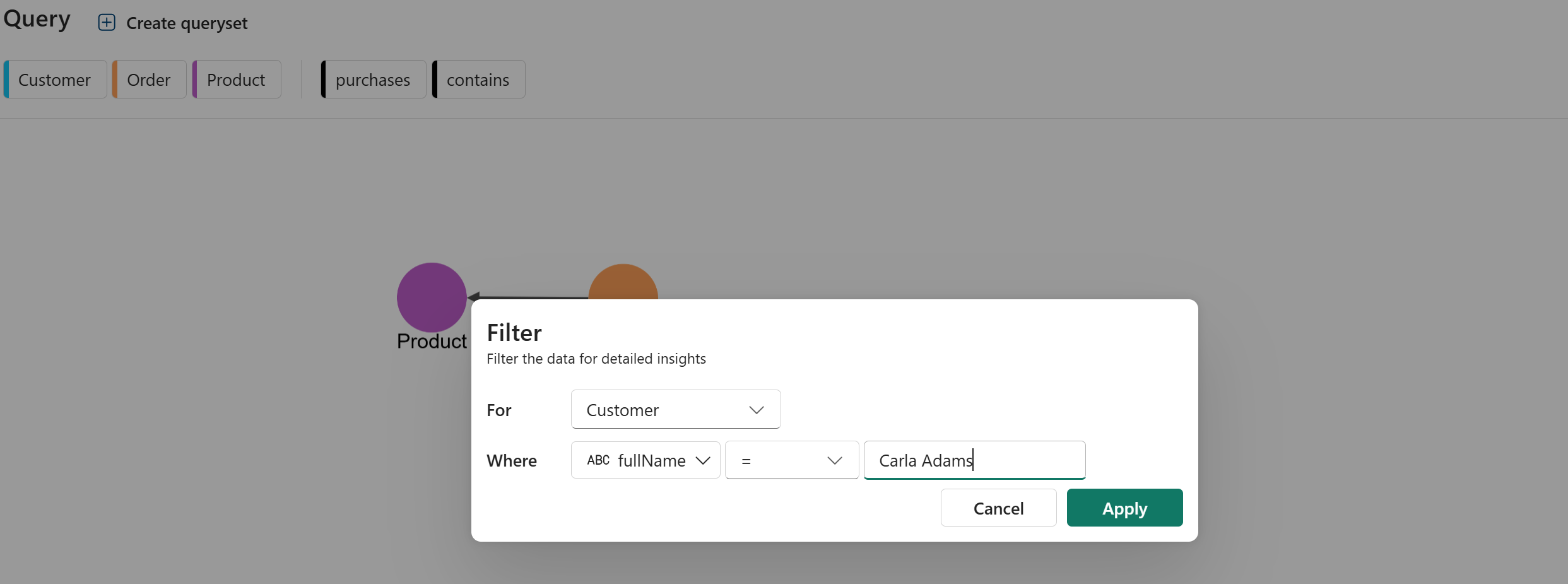 Byg en forespørgsel for at besvare spørgsmålet: "Hvilke produkter købte en bestemt kunde?" Denne forespørgsel gennemgår grafen fra Customer gennem til Order .Product For eksempel, for at forespørge kunden Carla Adams' køb, følg disse trin: