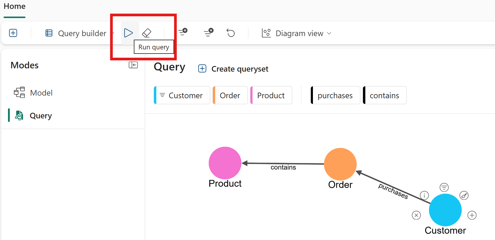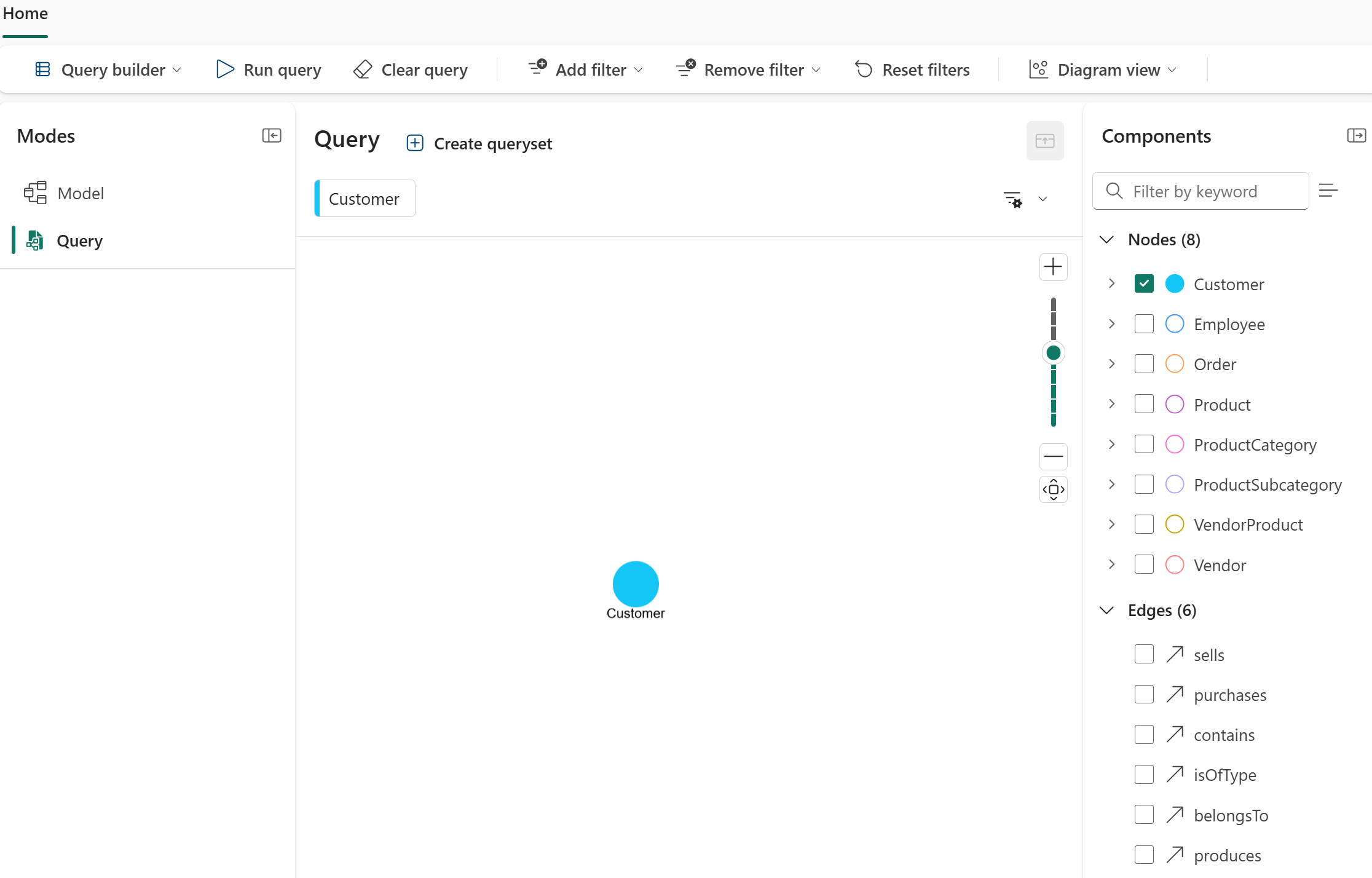 I dette tutorial-trin forespørger du din graf ved at bruge Visual Query Builder. Forespørgselsbyggeren giver en interaktiv måde at udforske din graf på ved at vælge noder og relationer.