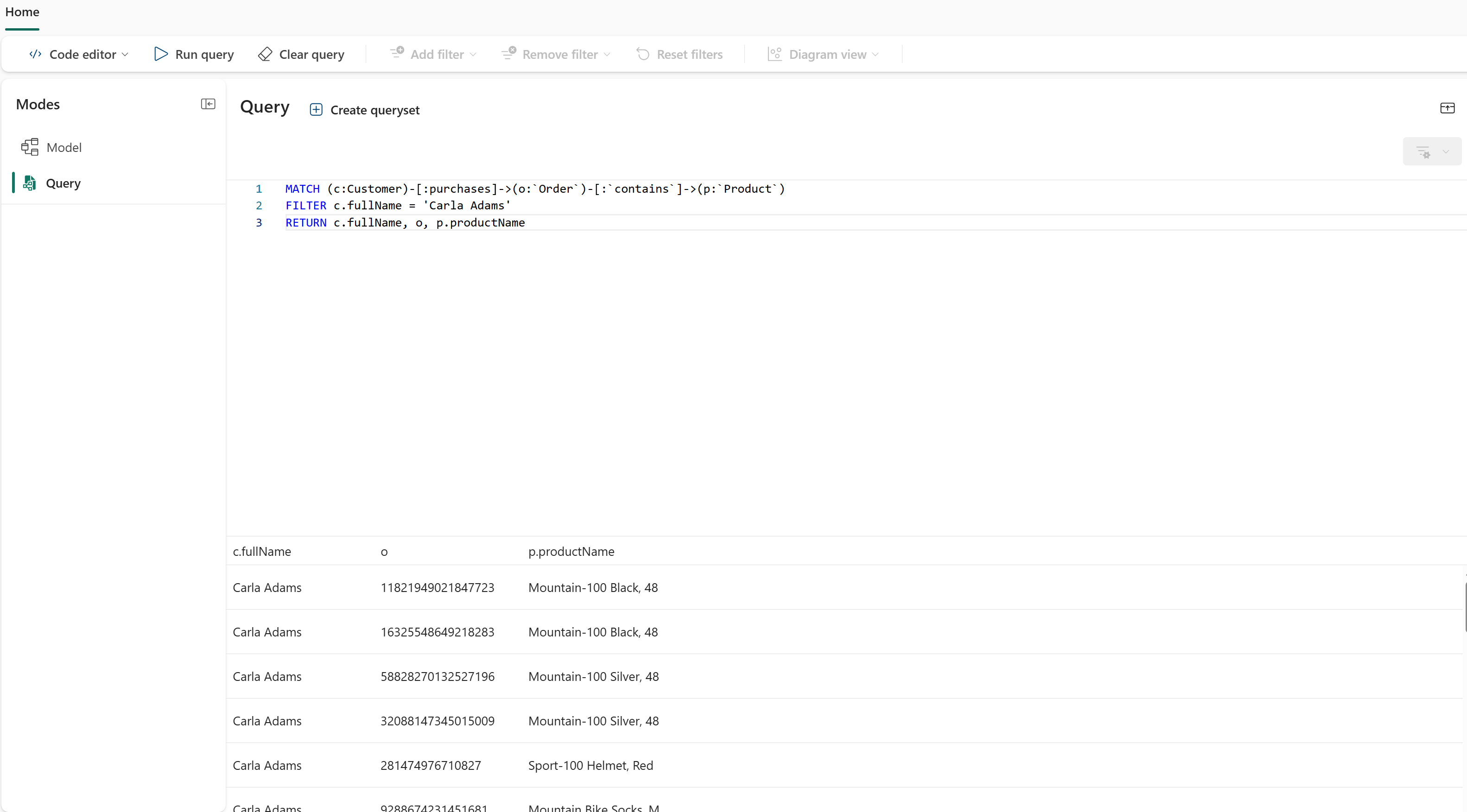 I det forrige tutorial-trin brugte du forespørgselsbyggeren til at finde ud af, hvilke produkter en bestemt kunde havde købt. Her er den samme forespørgsel skrevet i GQL: