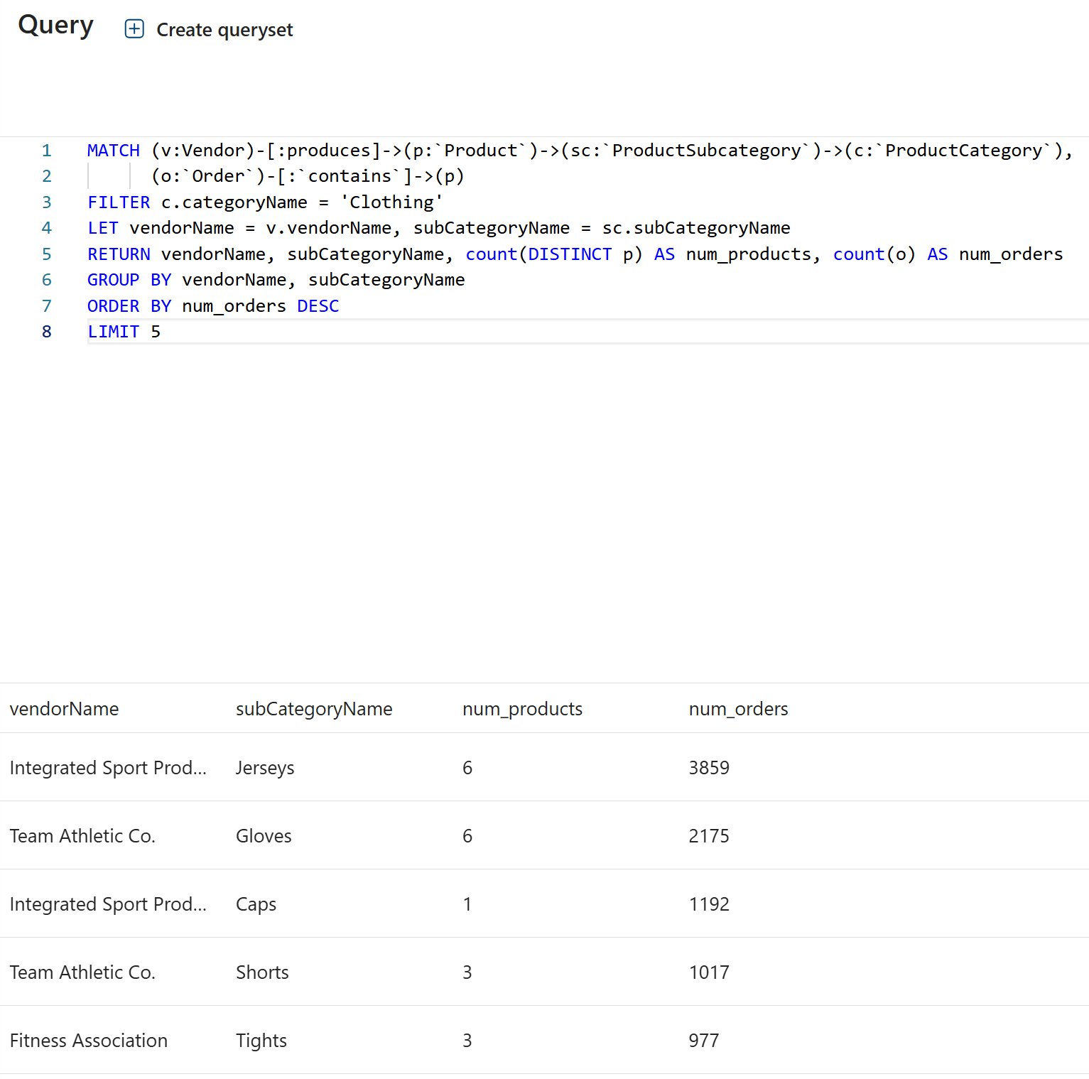 Du kan køre mere komplekse forespørgsler, der kombinerer matchende grafmønstre, filtrering, aggregering, sortering og begrænsning: