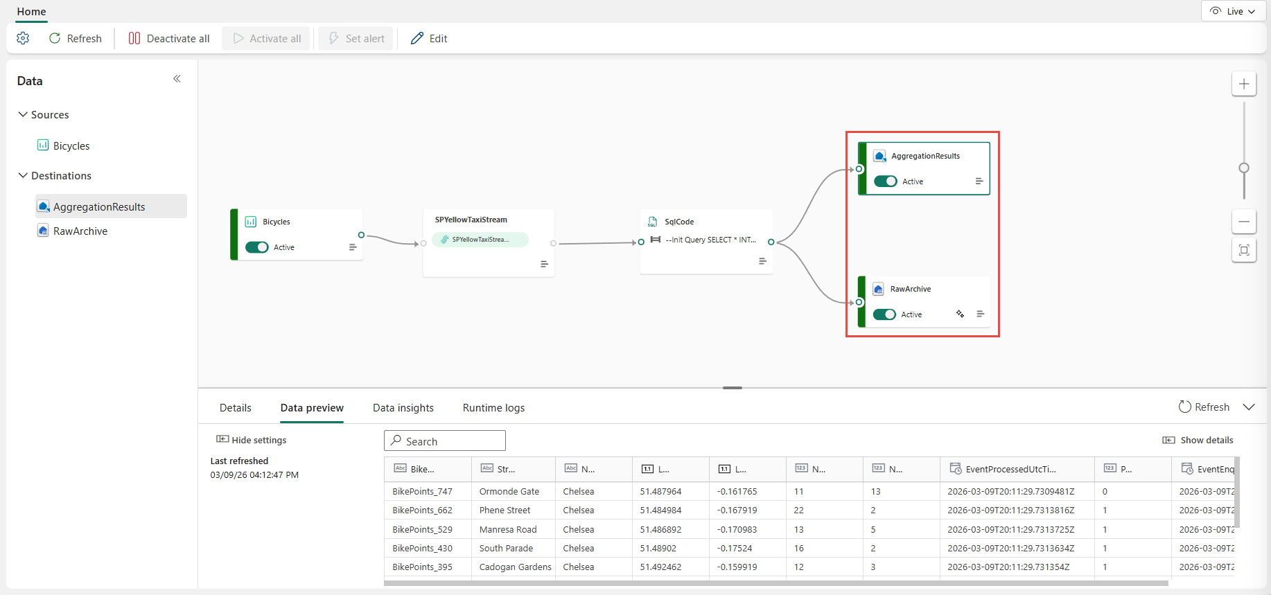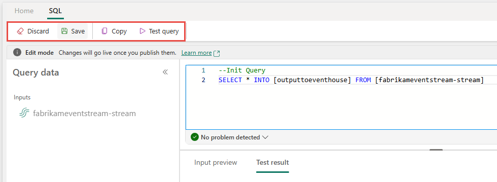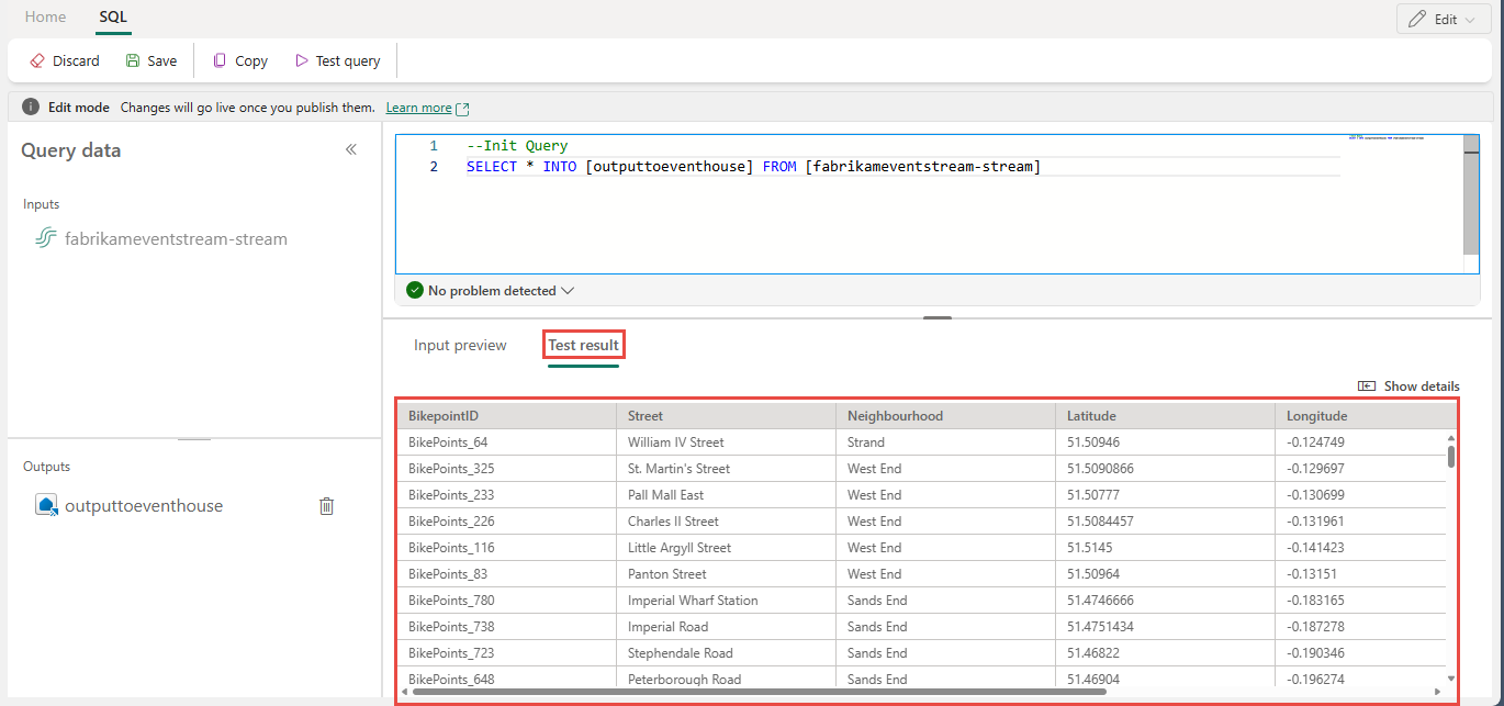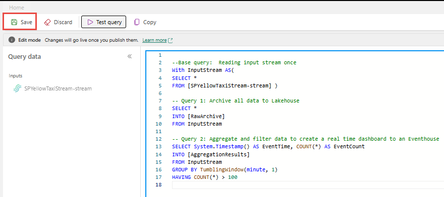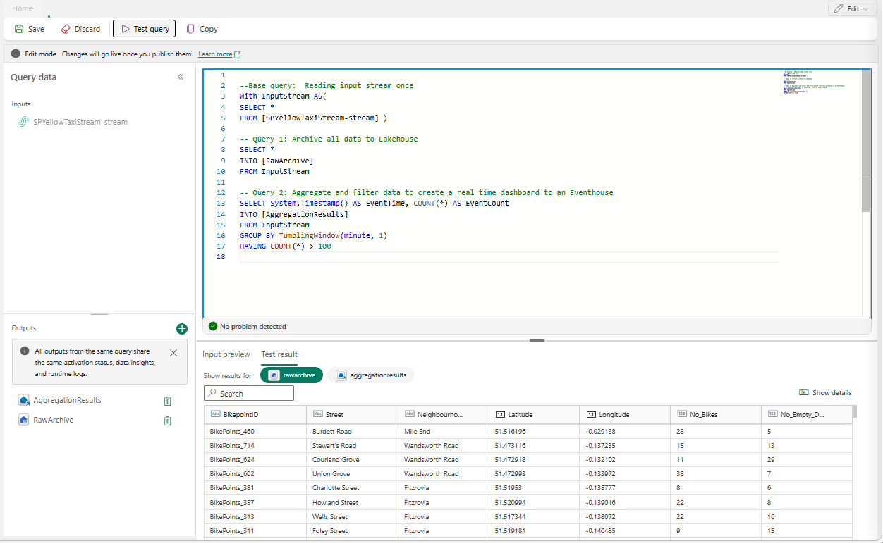 --Base query: Reading input stream once With InputStream AS( SELECT * FROM [SQLDemoES-stream] ) -- Query 1: Archive all data to Lakehouse SELECT * INTO [RawArchive] FROM InputStream -- Query 2: Aggregate and filter data to create a real time dashboard to an Eventhouse SELECT System.Timestamp() AS EventTime, COUNT(*) AS EventCount INTO [AggregationResults] FROM InputStream GROUP BY TumblingWindow(minute, 1) HAVING COUNT(*) > 100Vælg Testforespørgsel for at validere forespørgselsresultatet. Hvert output, der er defineret i forespørgslen, har en separat fane i testresultatpanelet .