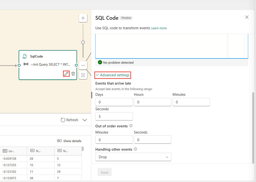 Vælg Rediger (blyant-ikon) på SQL-operatornoden for at åbne SQL-kodepanelet .