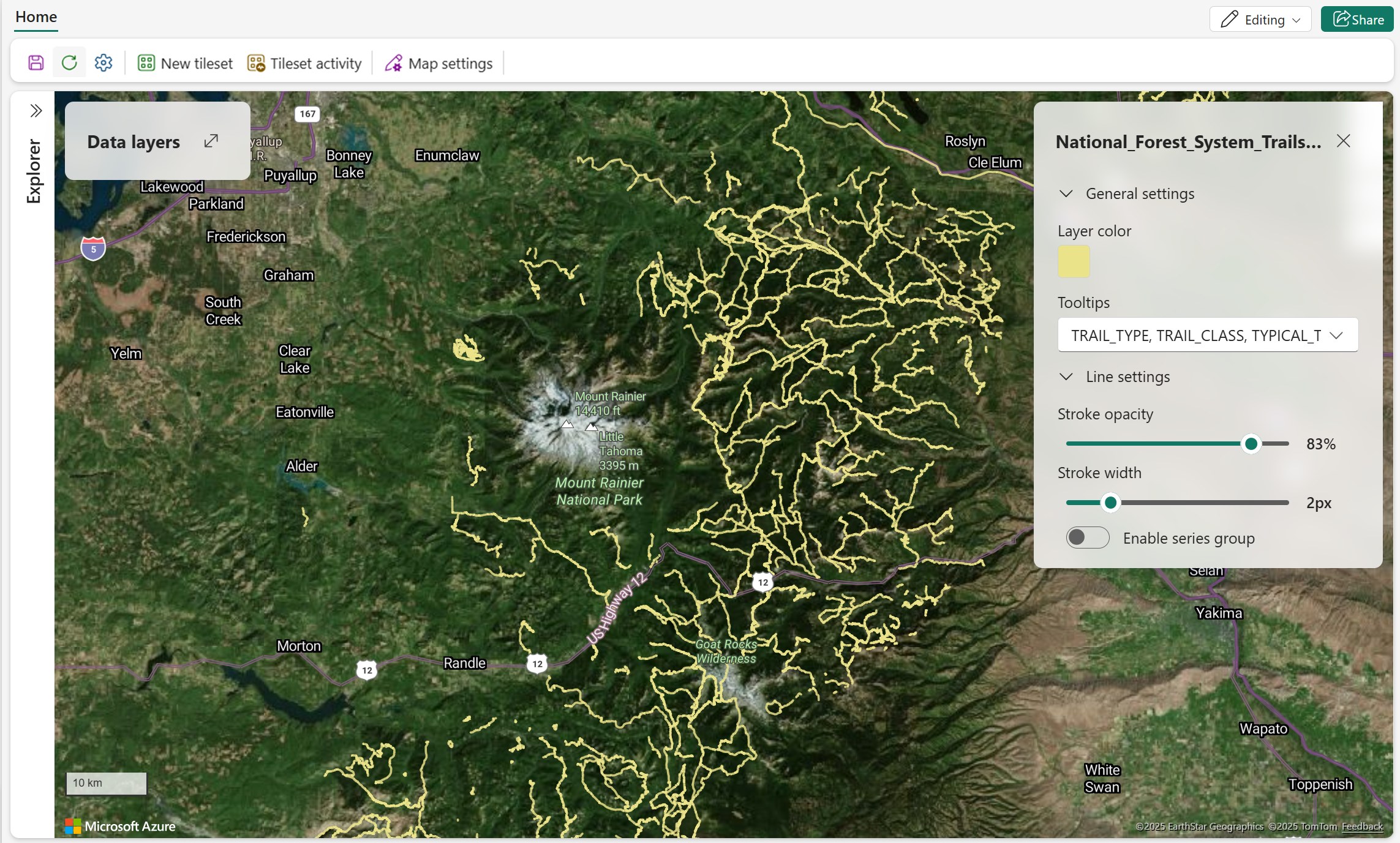 Følgende skærmbillede viser nationalparkstier nær Mount Rainier.