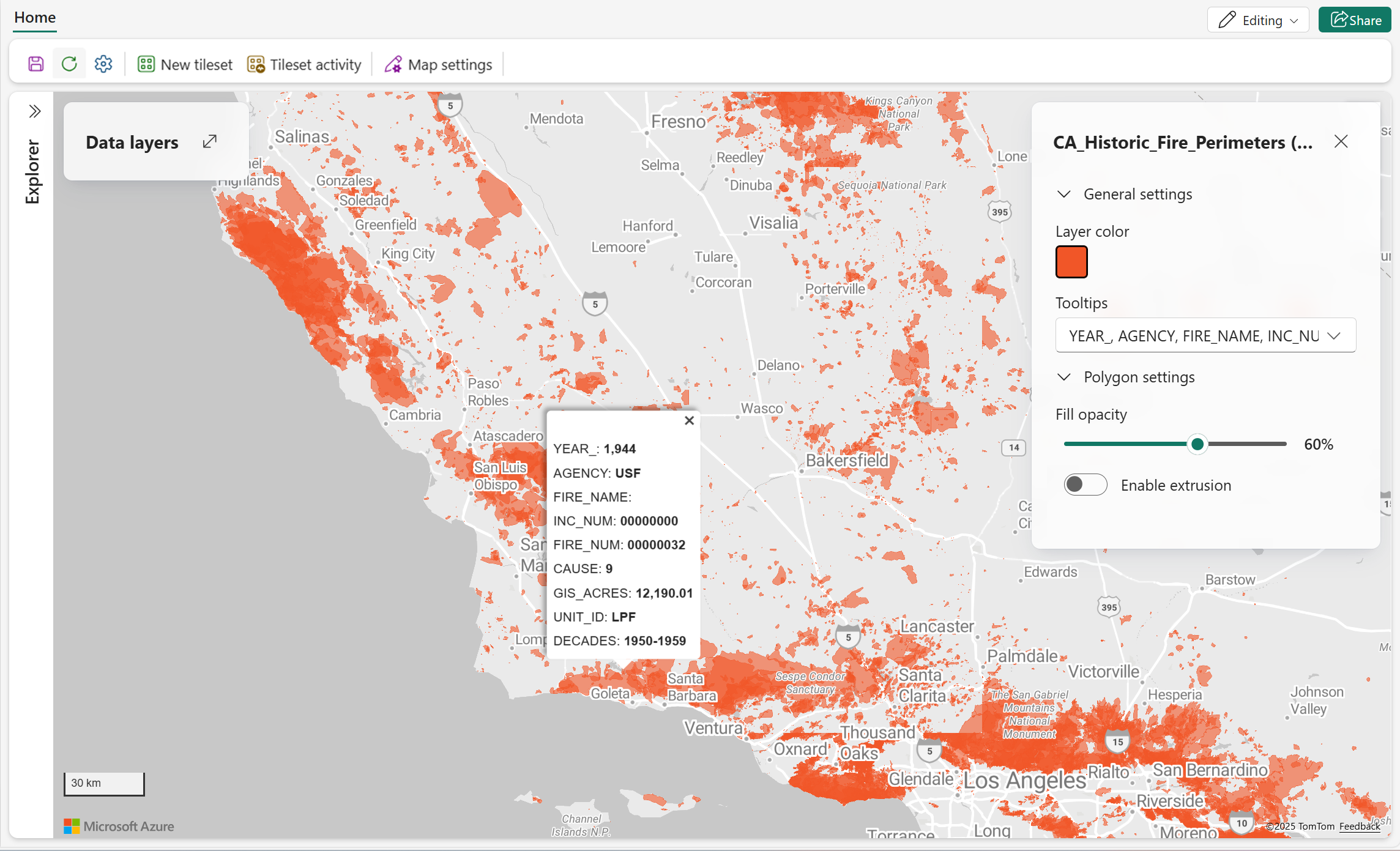 Følgende skærmbillede viser et historisk kort over brandperimetere over Californien, der viser den geografiske udstrækning af tidligere skovbrande ved hjælp af røde polygoner. Hver polygon repræsenterer en særskilt brandhændelse og indeholder metadata som f.eks. år, årsag og GIS-beregnet areal. Denne visualisering gør det muligt for brugere hurtigt at identificere brandudsatte områder, analysere historiske brandmønstre og understøtte afbødning af naturbrande og planlægning af arealforvaltning.