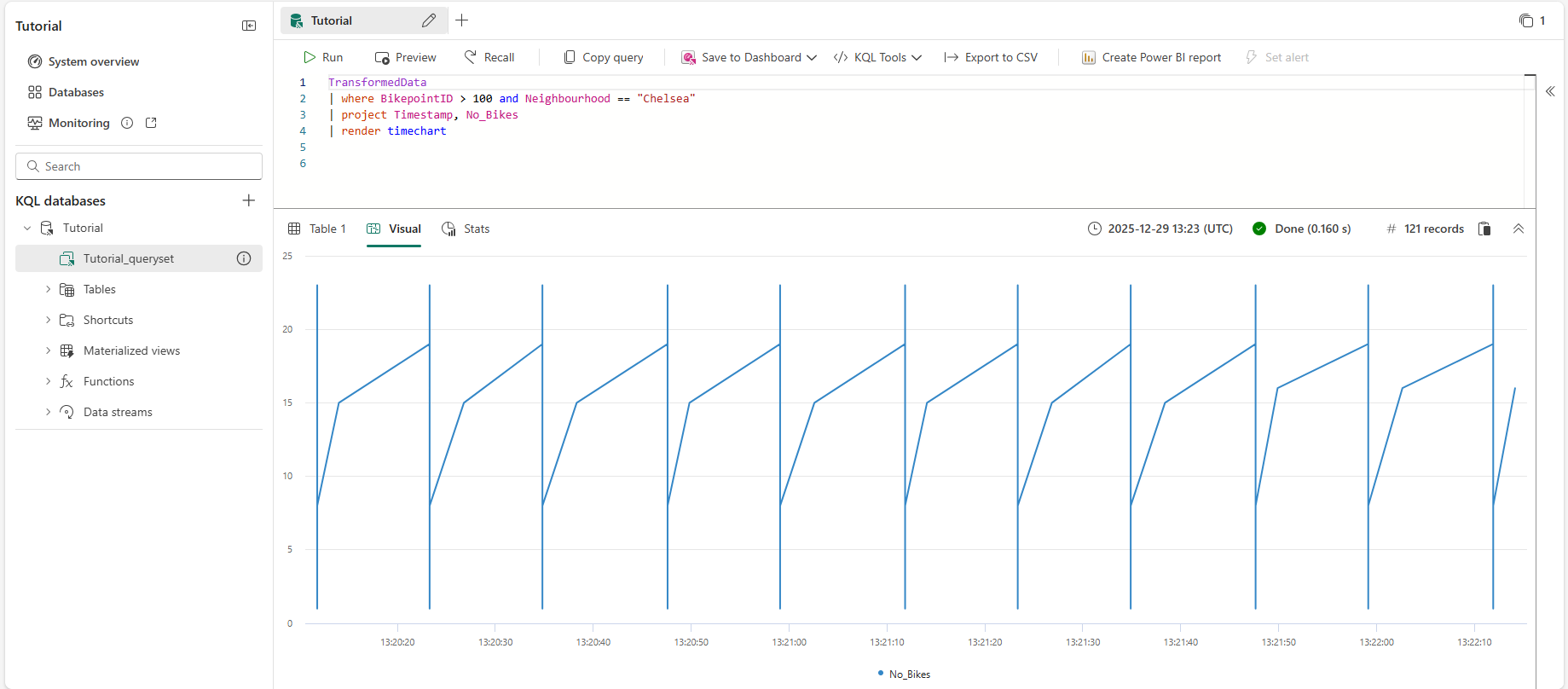 TransformedData | where BikepointID > 100 and Neighbourhood == "Chelsea" | project Timestamp, No_Bikes | render timechartDenne forespørgsel opretter et tidsdiagram, der viser antallet af cykler i Chelsea-kvarteret som et tidsdiagram.