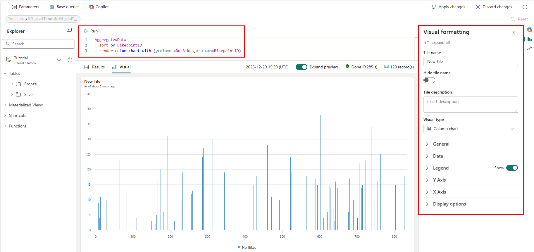 AggregatedData | sort by BikepointID | render columnchart with (ycolumns=No_Bikes,xcolumn=BikepointID)Vælg Gem på dashboard>Nyt Real-Time Dashboard.