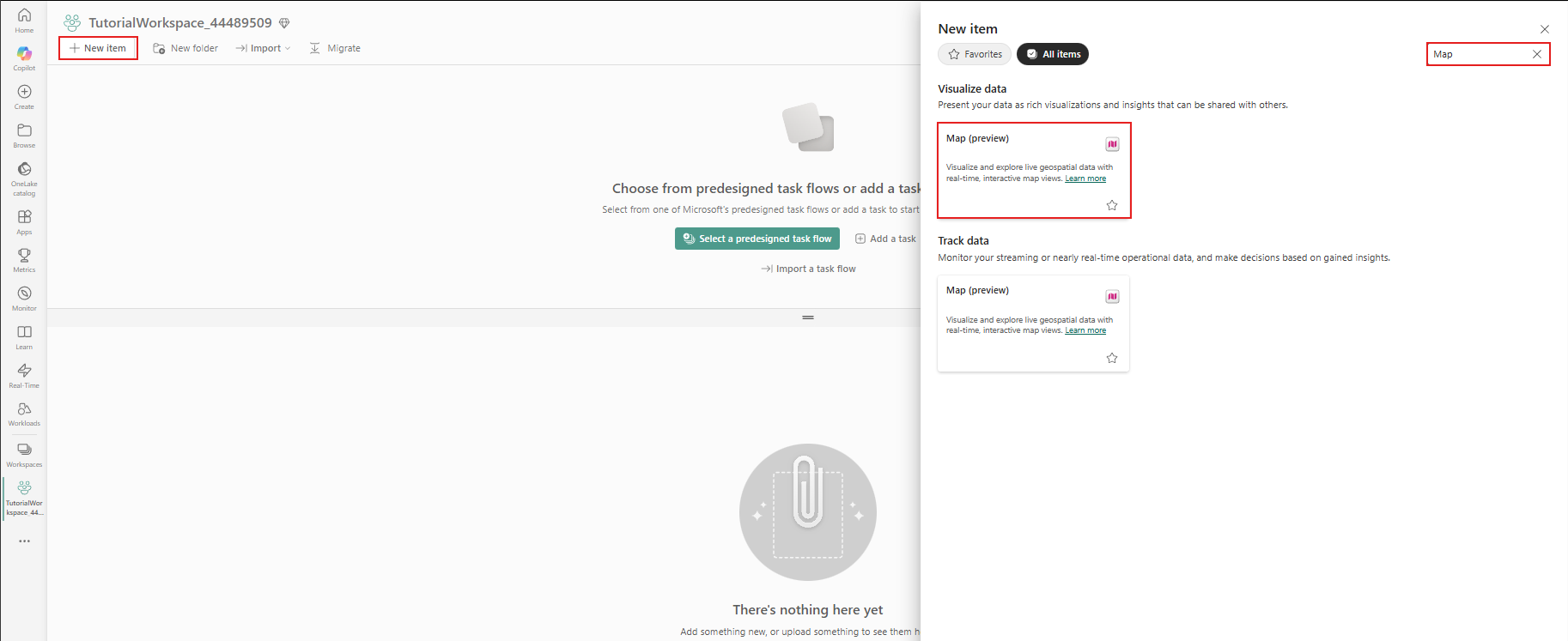 Gå til dit arbejdsområde, og vælg knappen + Nyt element i øverste venstre hjørne. Søg derefter efter og vælg Kort.
