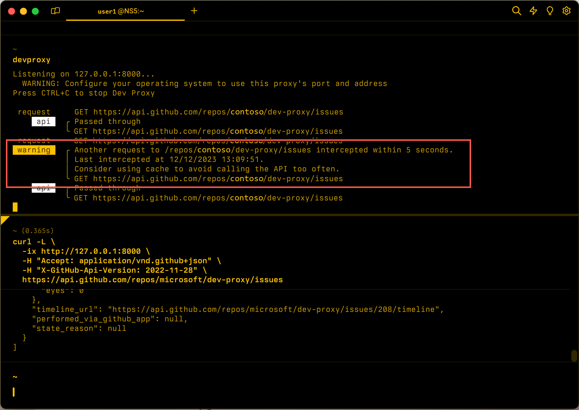 Shows a warning when Dev Proxy intercepted the same request within the specified period of time.