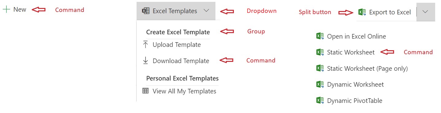 - Kommando. Standardknap. Udfører en handling, når den vælges. Kan også indlejres i grupper på rullelister og opdelingsknapper. Disse blev kaldt flyouts i klassisk styring.
