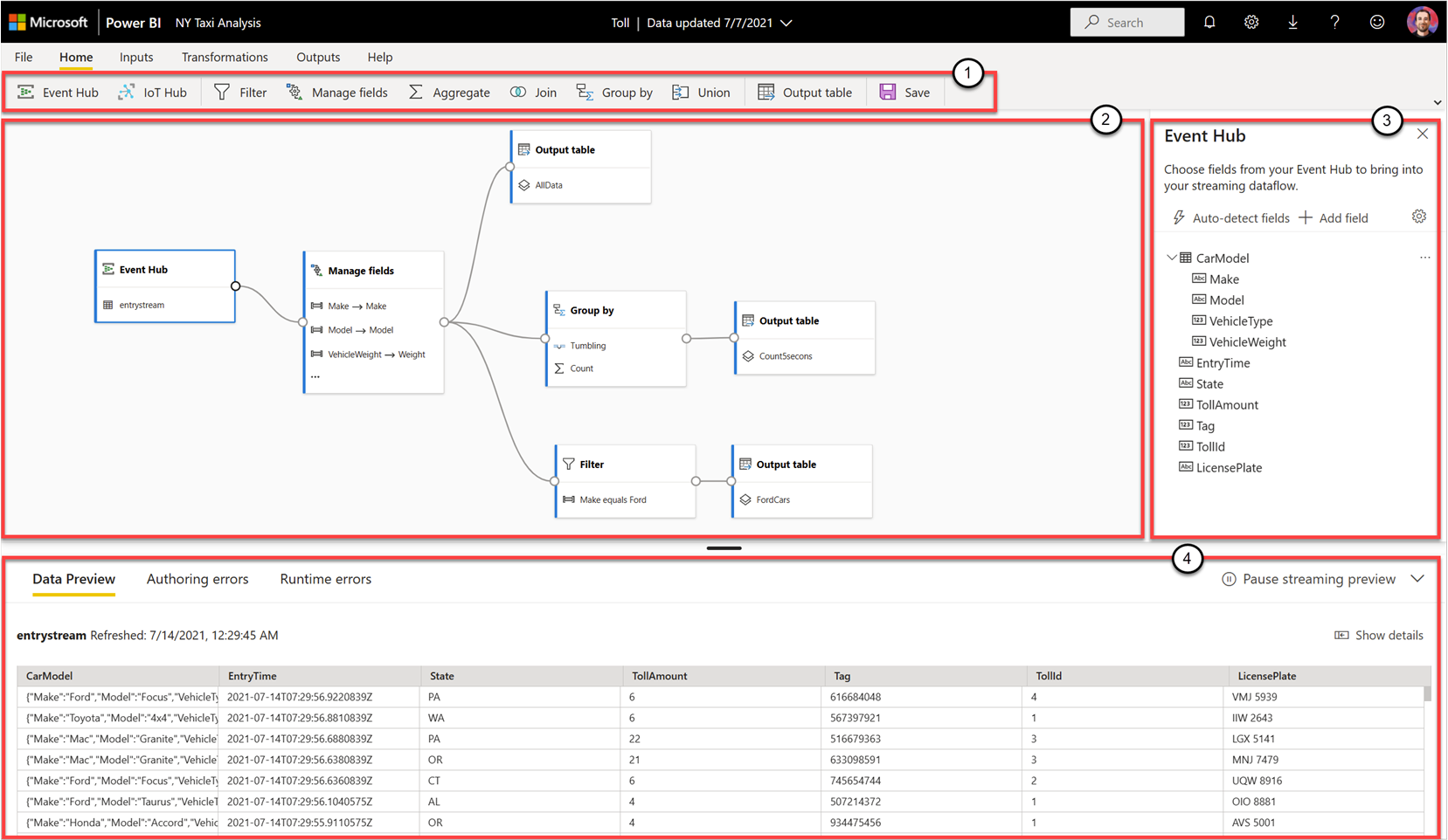 På følgende skærmbillede vises et færdigt dataflow. Den fremhæver alle de sektioner, der er tilgængelige for dig til oprettelse i brugergrænsefladen for streamingdataflow.