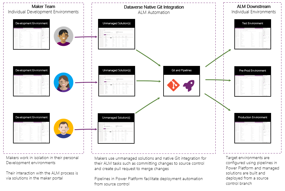 Power Platform indeholder mange standardfunktioner, der gør det muligt for organisationer at administrere ALM (Application Lifecycle Management) for deres løsninger. Inkluderet er muligheden for at pakke løsninger som containere til de mange forskellige typer objekter i platformen, administrere miljøer, der er involveret i applikationens livscyklus, og udrulle løsninger ved hjælp af pipelines i Power Platform. Der er også mulighed for at integrere Git-lagre ved hjælp af Power Platform-udviklerværktøjer på flere måder. Med oprindelig integration af Git i Dataverse er processen forenklet og strømlinet, så udviklere kan arbejde med deres løsninger på en velkendt måde og interagere med kildestyring via forenklede grænseflader i Power Apps (make.powerapps.com).