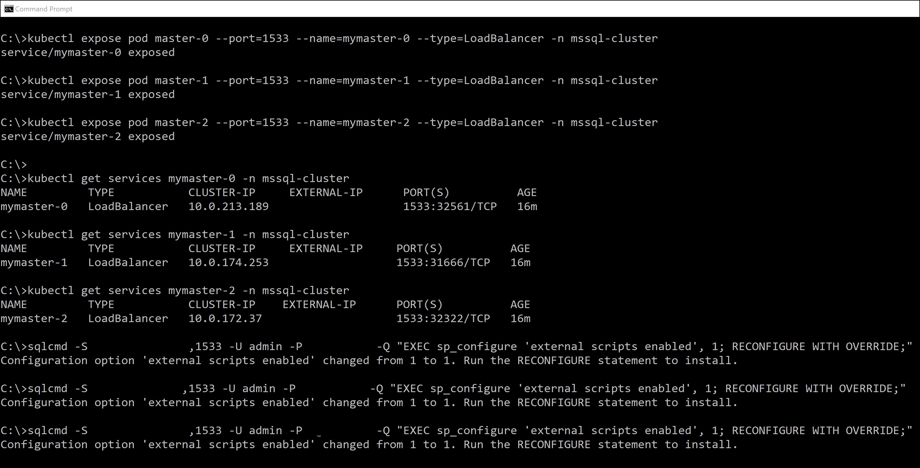 kubectl expose pod master-1 --port=1533 --name=mymaster-1 --type=LoadBalancer -n mssql-cluster