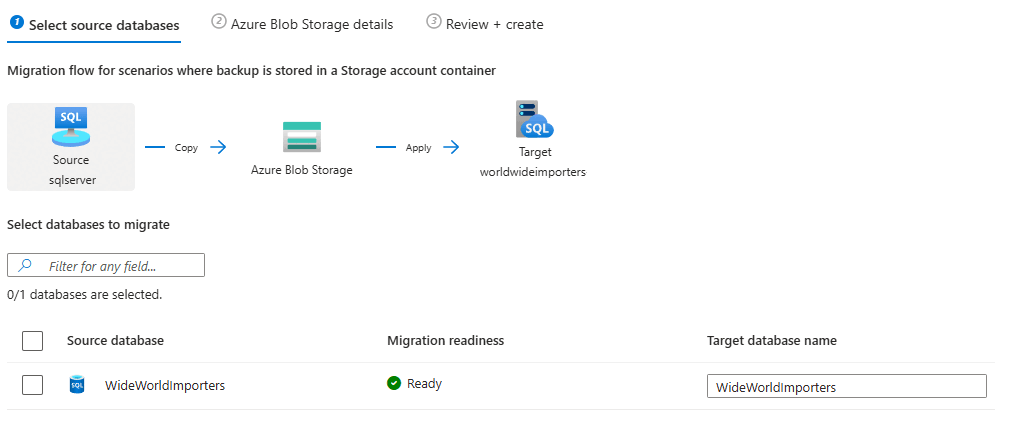 - If you already have an instance as a target, choosing Select target takes you to the Database migration pane for your SQL Server instance. The instance name is populated as the selected target. Then you can proceed to the Migrate data step.