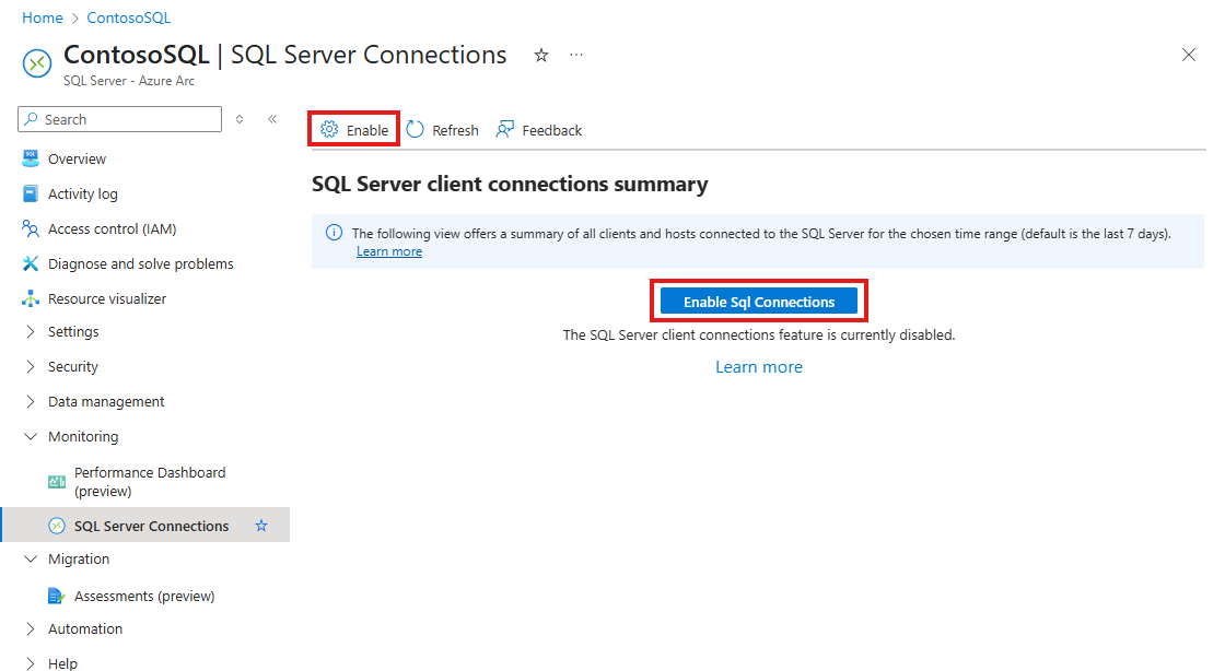 By default, the SQL Server Connections view is available to all SQL Server instances enabled by Azure Arc. Data collection starts as soon as the instance is connected to Azure. Azure Connected Machine agent automatically polls sys.dm_exec_sessions hourly. The portal displays the data collection time. The service maintains the data for 30 days.