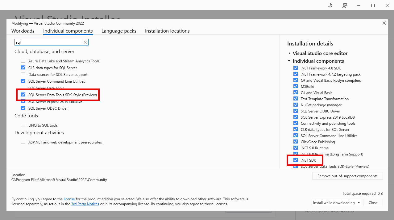 During install, select the Individual components tab and search for "SQL" to locate and select "SQL Server Data Tools SDK-style (Preview)". Selecting this item automatically selects required dependencies.