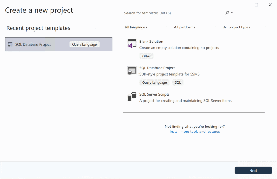 In the New Project dialog box, use the term SQL Server in the search box. The top result is SQL Server Database Project, SDK-style (preview).