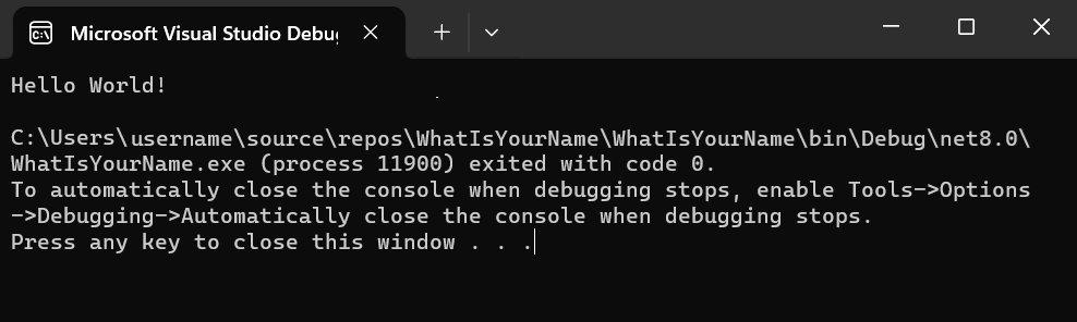 In File Explorer, navigate to the bin\Debug\net8.0 directory and run WhatIsYourName.exe.