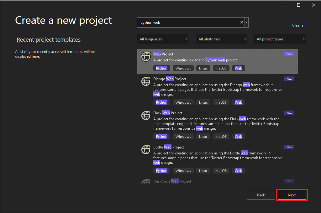 In the Create a new project dialog, enter Python web in the search box. In the results list, select Web Project, and then select Next.