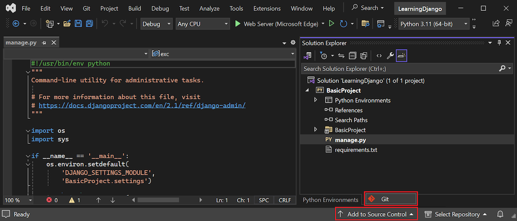 Open Solution Explorer to view your solution and project files. The initial project contains only two files, manage.py and requirements.txt: