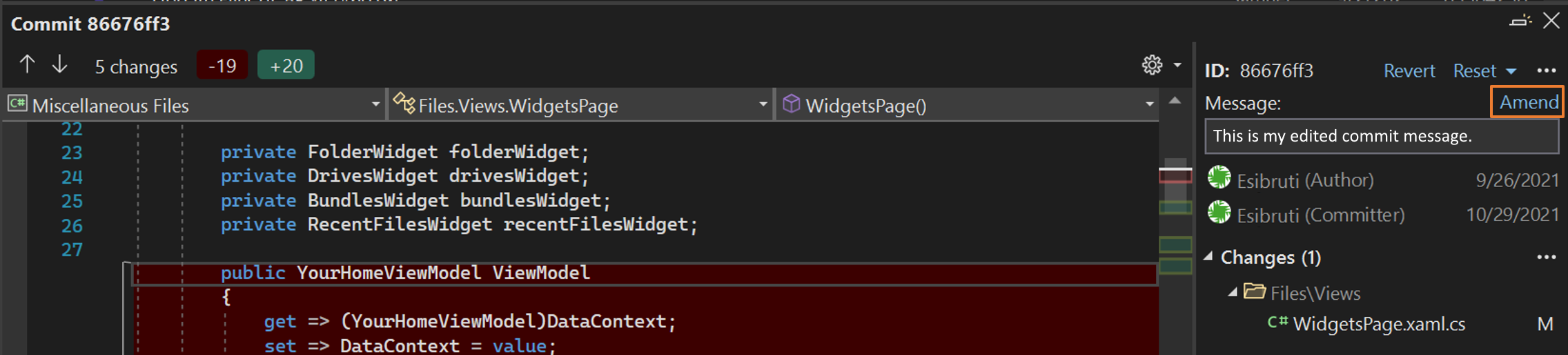 In the previous example, the commands will undo the changes made in commit 53333305 and create a new commit on the branch. The original commit is still in the Git history. To do the same in Visual Studio, right-click the commit you want to revert and then select Revert. After you confirm your action and the operation is complete, Visual Studio displays a success message and a new commit appears in the Outgoing section.