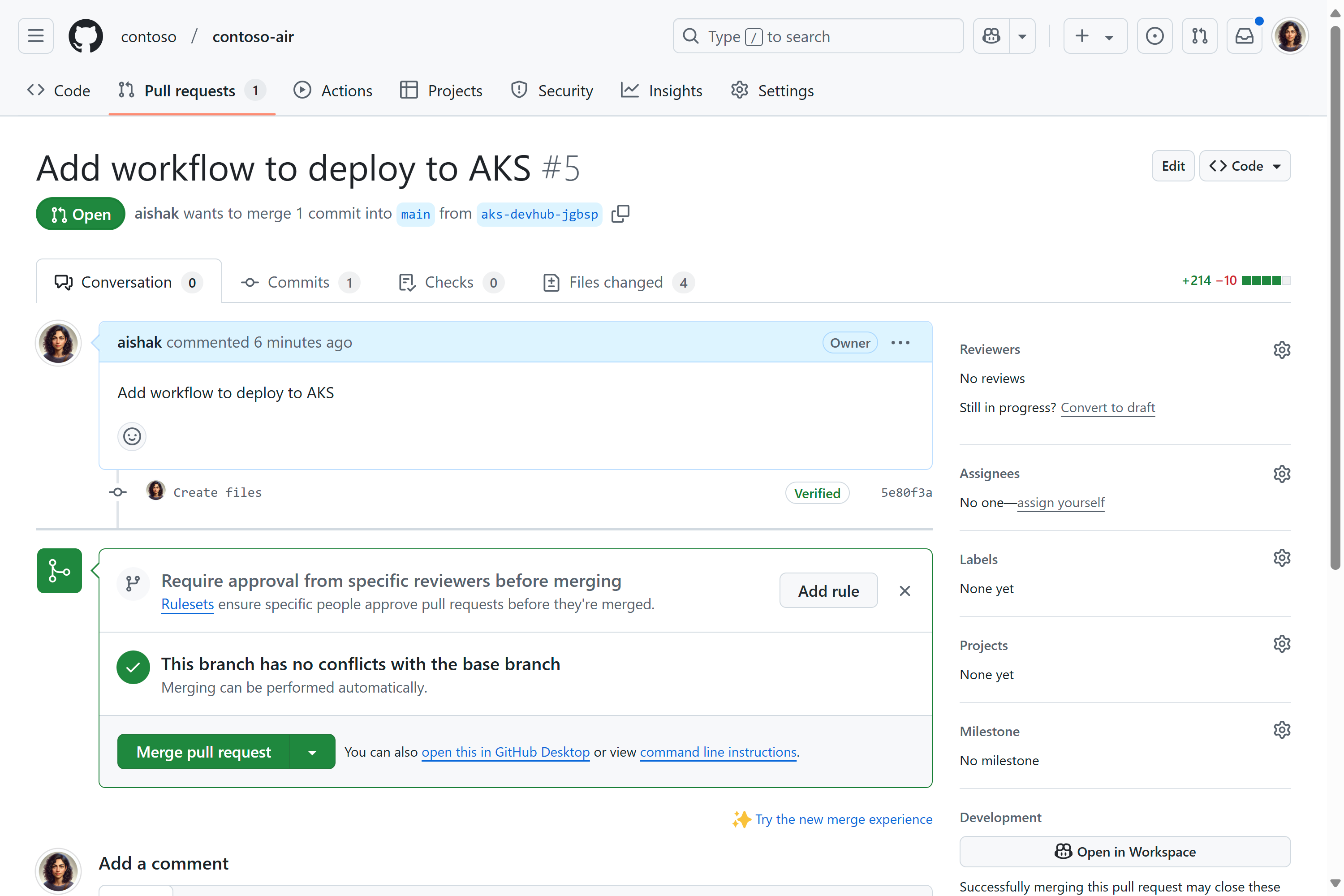 - Wählen Sie "Zusammenführen"-Pullanforderung aus, um die Änderungen in Ihrem Code-Repository zusammenzuführen.